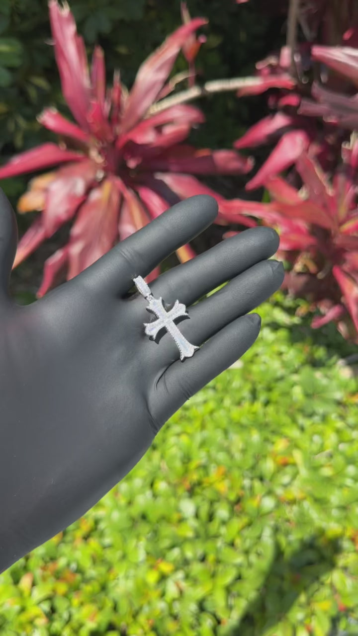 This gothic-style cross pendant is crafted in solid sterling silver and iced with premium cubic zirconia for a bold, high-end finish. With a detailed silhouette and balanced weight, it’s built to elevate your look without trying too hard.