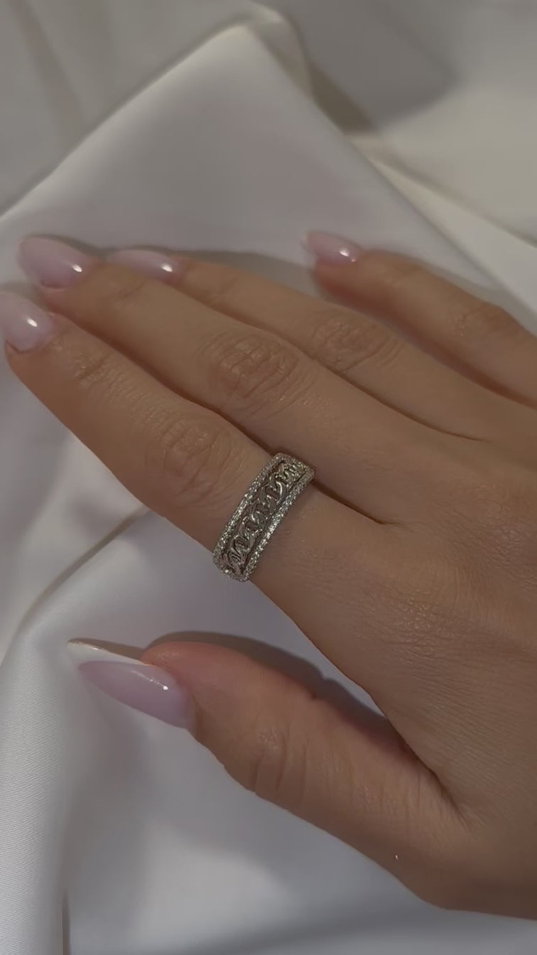The Diamond & Chain Link Ring is a stunning piece of jewelry that effortlessly combines classic Cuban link design with sparkling cubic zirconia diamonds. Featuring a center of Cuban links, surrounded by two rows of high-quality cubic zirconia diamonds, this ring is both eye-catching and elegant. Available in sterling silver and 14k gold plated finishes, this ring is the perfect addition to any jewelry collection, adding a touch of luxury and refinement to any outfit.